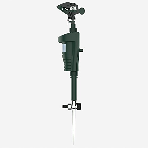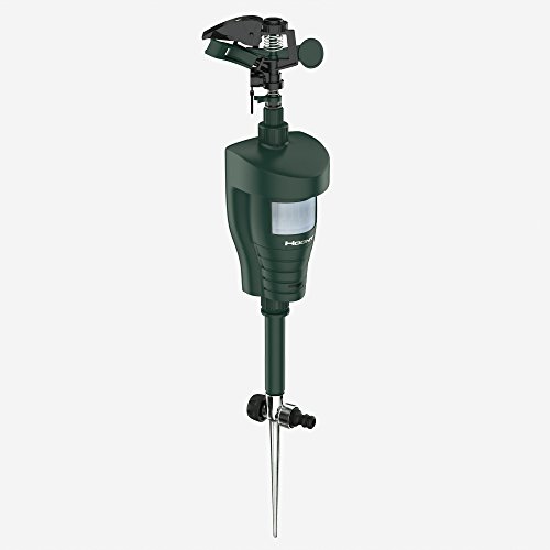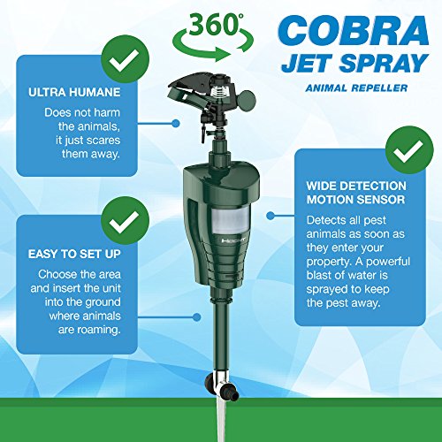 -. Feature : POWERFUL & EFFECTIVE - The Hoont™ Cobra Water Jet Blaster Animal Repeller sprays a powerful yet harmless jet of water as soon as it detects an animal invading your property. Scares away all animals, such as cats, dogs, squirrels, skunks, deer, wild animals, birds, etc. Animals are startled and quickly leave the area and will avoid the area in the future. / EASY SET UP & ADJUSTABLE - Very easy to set up. Choose the area where animals are roaming, insert the unit into the ground using the provided stake and connect to a garden hose. As soon as a pest animal is detected by the motion sensor, a powerful blast of water is sprayed to scare the pest away. / LOW WATER CONSUMPTION - When the built-in sensor detects movement within a range of up to 30 feet, the jet of water is activated for approximately 5 seconds. Animals are frightened by this jet of water and immediately leave the monitored area. / 100% HUMANE & SAFE FOR YOU AND YOUR PETS - The Hoont™ Cobra Water Jet Blaster Animal Repeller is the most humane method for keeping animals and pests out of your property. It doesn't kill or harm the animals; it just sprays them with an annoying squirt of water, thus forcing them to leave the area. / SPECIFICATIONS - Requires 2 "AA" batteries (Batteries not included) / Motion sensor detection range up to 30 ft. / Detection angle: Approx. 120° / Water spraying angle: 360° (adjustable) / Monitored area: Approx. 1076 sq. ft. / Effective during day and night. / New upgraded components for optimal performance.