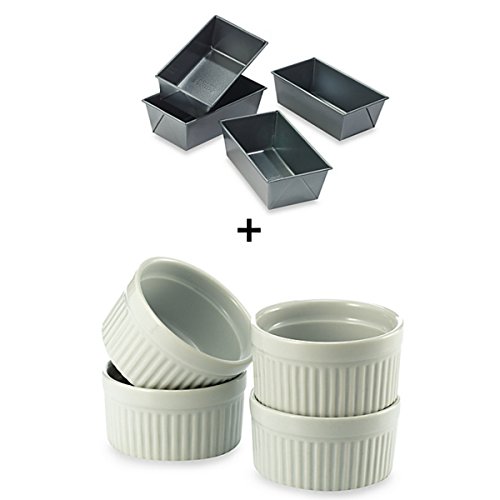 Set of 4 Mini Loaf Pans with Armor-Glide Coating by Chicago Metallic Professional & BIA Cordon Bleu and Set of 4 - 8 oz. Porcelain Ramekins White Bowls 8 ounce