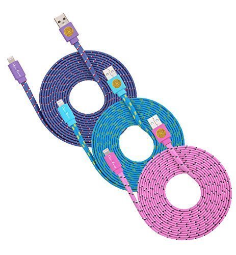 10ft Braided Flat Noodle Lightning Cables for iPhone 6s, 6 Plus (ple blu pnk)