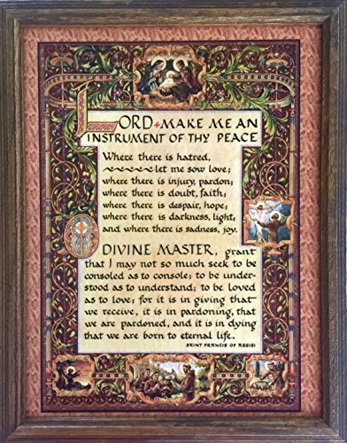 Simple Prayer for Peace, written by St. Francis in the 12th Century. The Oak frame measures 11.5 x 14.5 x .75 (optional hanging hardware included) it is also suitable for an easel stand (not included). This is an inspirational gift in these troubled times. Keep in mind that this is a natural wood product. There will be slight variations in the appearance of the grain and the stain. This is an inexpensive and quick alternative to costly custom framing.Feature