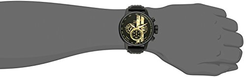 -. Feature : Chronograph functions with 60 second, 60 minute and 24 hour subdials / Black dial with gold striped accent, white and gold tone hands and black Arabic numerals; luminous; GMT; mineral crystal; black ion-plated stainless steel case; black perforated leather strap with beige background / Japanese-quartz Movement / Case Diameter: 48mm / Water Resistant To 330 Feet