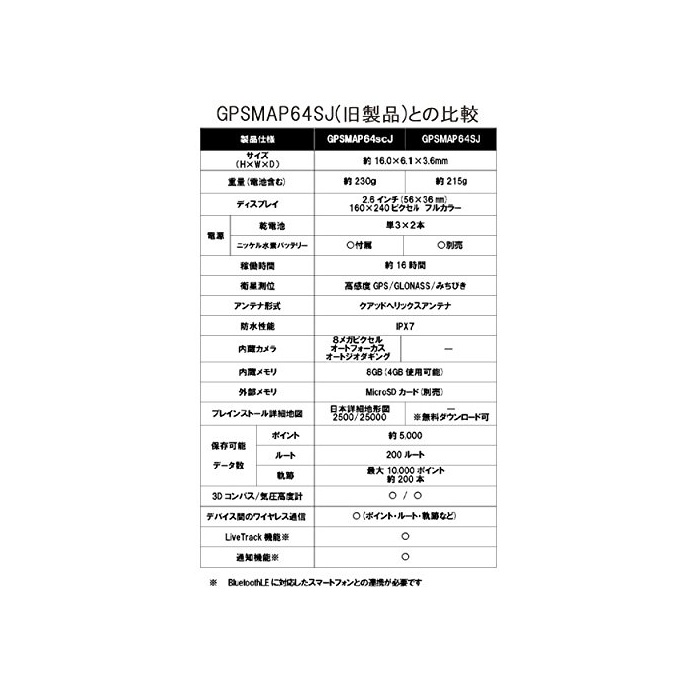 인터페이스:고속USB와 NMEA0183호환/카메라:있음(8메가 픽셀,오토 포커스,자동 지오《다긴구》부착)/기압 고도계:고도 및 기압을 표시/전자 kompas:3축 kompas/유닛간 wireless 통신:○, ●【지도와 메모리】맵 베이스 맵:일본 상세 지형도(2500/25000)1/20만 일본 전국 지도 내장(루트 검색 가능)/옵션 지도:별매의 지도 제품 사용가/내장 메모리:8GB/대응 데이터 카드:microSD카드(별매)/커스텀POI:○/포인트:약5000포인트/