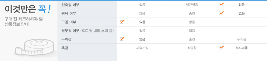 | ※ 모니터 해상도, 발기, 컴퓨터 사양 , 이미지에 따라 약간의 색상 차이가 있을 수 있습니다. ※ 품질경영 촉진법에 의한 품질 표시를 꼭 참조하시어 세탁하십시오 |