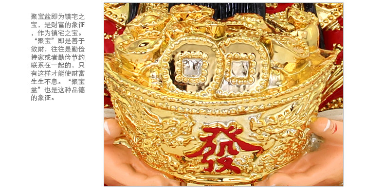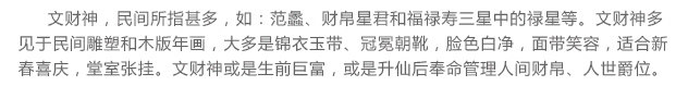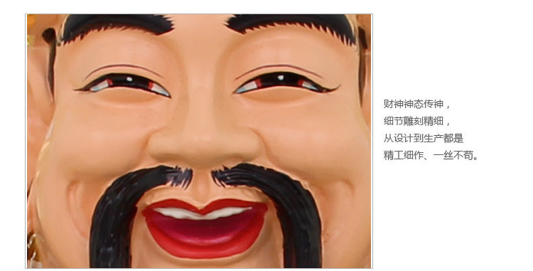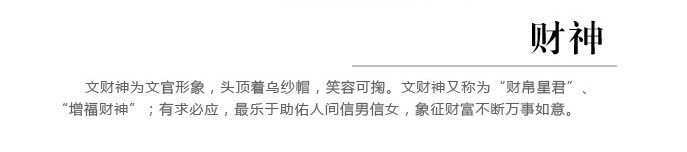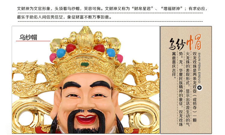 文财神为文官形象,头顶着乌纱帽,笑容可掬。文财神又称为"财帛星君"、"增福财神";有求必应,最乐于助佑人间信男信女,象征财富不断万事如意。