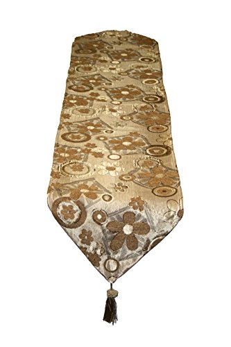 -. Feature : Update your home decor with this attractive Victoria Chenille Jacquard daisy design table runner . / Table decoration with attractive Victoria Chenille Jacquard daisy design will add a fresh touch any room / Table runner is accented with matching tassels on each end / Available in Brown/Gold, Burgundy/Gold and Gold color options, / Machine Washable, Imported .