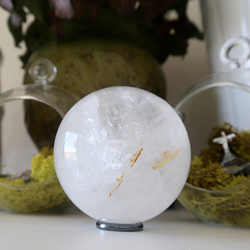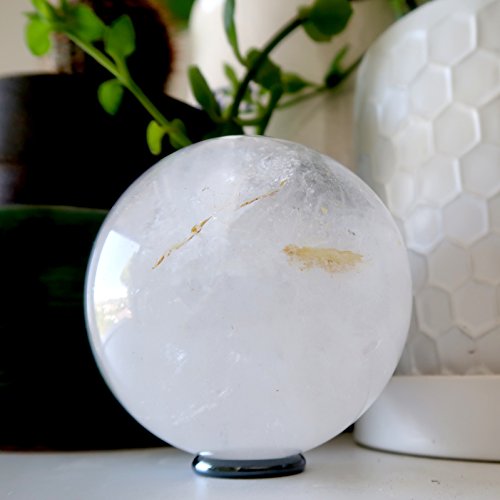 One-of-Kind: Natural Clear Quartz is polished into your new crystal healing ball. This clear gemstone shows shiny plane inclusions, Iron minerals and rainbow sheen. The unique ball comes with a metallic black Hematine display stand.