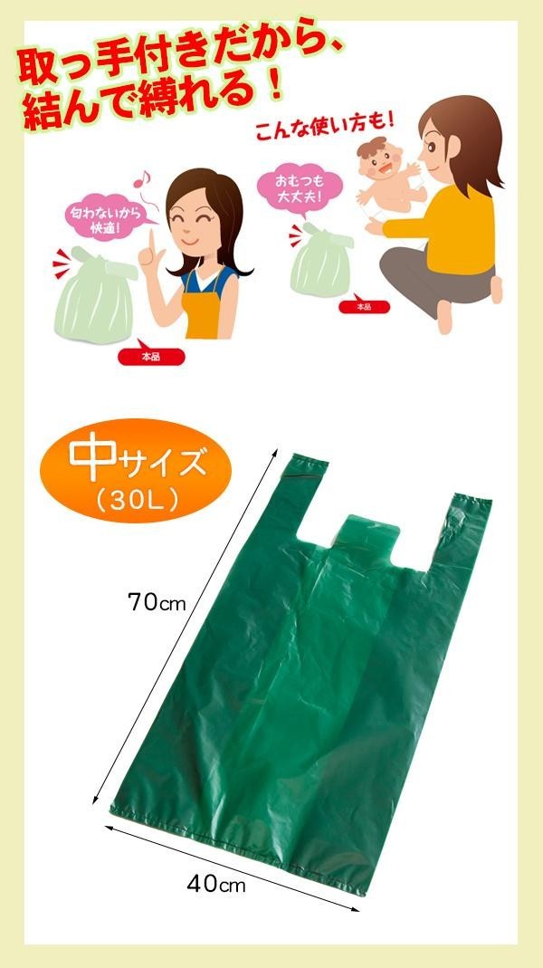 | 取っ手付きだから、結んで縛れて便利!消臭剤配合でニオイ成分をしっかり吸着するので、生ごみ・おむつ・ペットのトイレなど、ニオイの気になるゴミを捨てるのにぴったりです! |