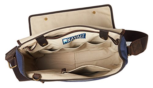 -. Feature : Computer compartment fitting laptops up to 13" / Interior zippered pocket & organizer pockets, Exterior zippered pocket, Magnetic snap buckle closures, Reinforced leather bottom / High quality brass zippers, Adjustable canvas shoulder strap with padded leather shoulder rest / Interior: 15 ½"(w) x 12"(h) x 4"(d) Exterior: 16 ½"(w) x 13"(h) x 5-1/2"(d)
