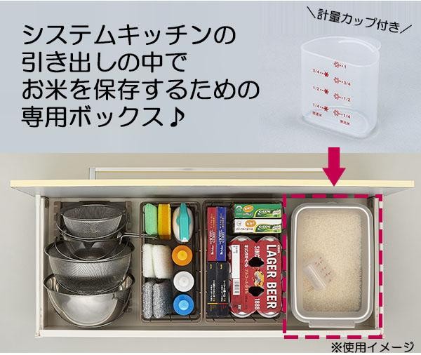 システムキッチンの引き出し内でのお米の保存にピッタリの専用ボックス☆便利な計量カップ付きです。