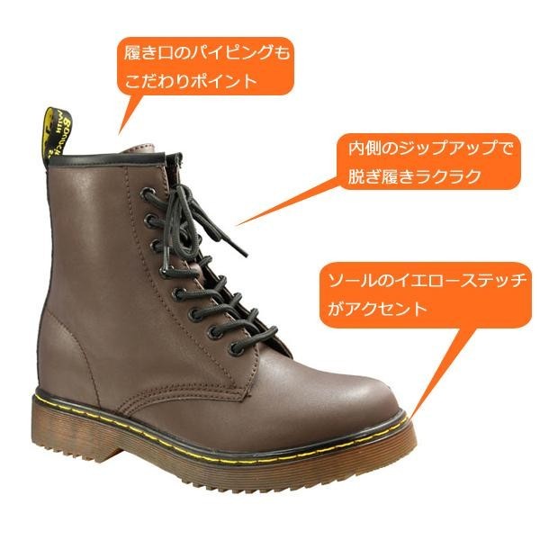 | ベーシックな8ホールのレースアップブーツです。インヒール内蔵でさりげなく美脚&足長効果!内側にジップアップが付いているので、脱ぎ履きも簡単です。合成皮革を使用しており、軽量で汚れや水にも強いのがポイント!!オールシーズン活躍する優れものです♪ |