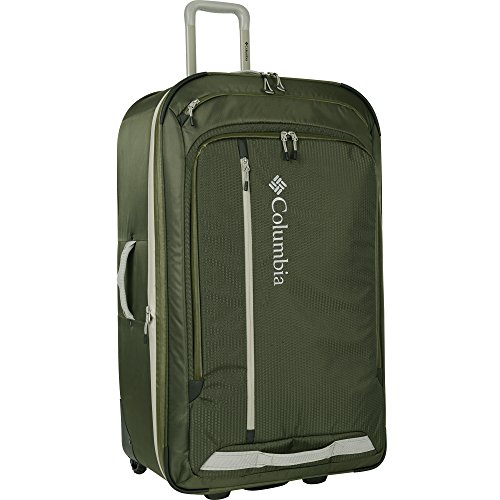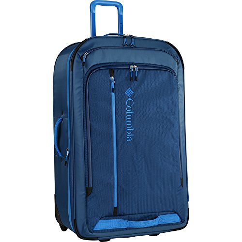 Studio : Columbia Publisher : Columbia Binding : Apparel Product Description PVC free Triangle pattern ripstop / 420D dobby Push-button locking trolley handle Treaded wheel system with rugged frame PU coated reversed water resistant zippers Double layer reinforced web carry handles Molded foot stand with integrated handle Vertical front stash pocket plus two exterior pockets Hidden pull out ID tag Fully lined interior with two mesh pockets and elasticized adjustable valet straps 21" x 14.5" x 7.25" 0