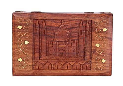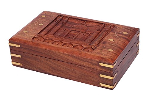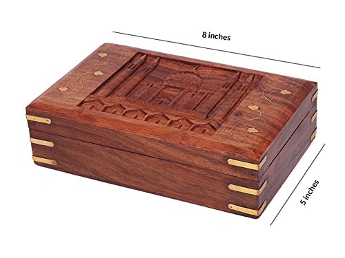 -. Feature : Dimensions: Length - 8 inches x Width - 5 inches x Height - 2 inches. / Exquisite box is made using one of the richly hued timber Indian Rosewood and further adorned with hand carvings of the wonder Taj Mahal motif. / The beauty, rawness and character of timber will guarantee this piece to be a unique addition to any decor with its country rustic feel / Store your jewelry, trinkets, treasures, collectibles, tarot cards, Fend shui items, incense, herbs, tools and whatever makes you happy / Dated back to 400 years ago in the Mughal period, artisans of Saharanpur started wooden carving work and now 1,00,000 artisans are involved in this industry making world's finest handicrafts
