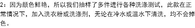 2: because the color is bright, so we sampled a number of various washing test, this section under normal circumstances, adding detergent or detergent, whether in cold water or warm water cleaning, will not fade.