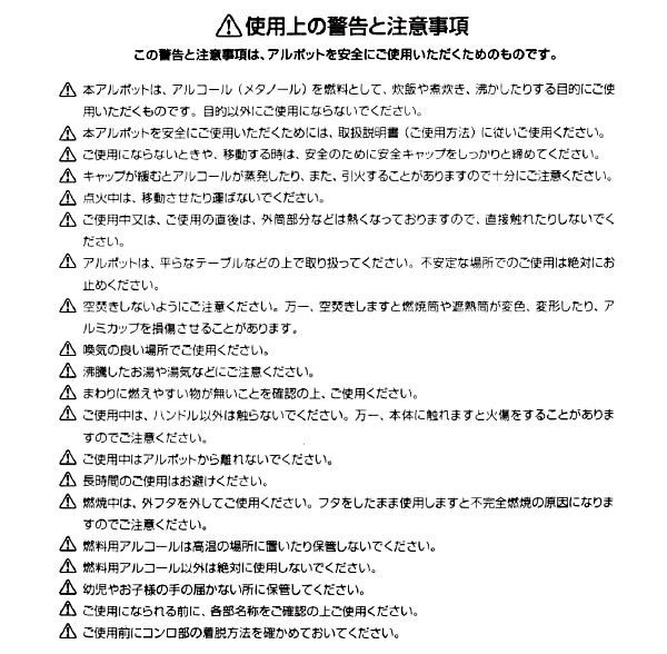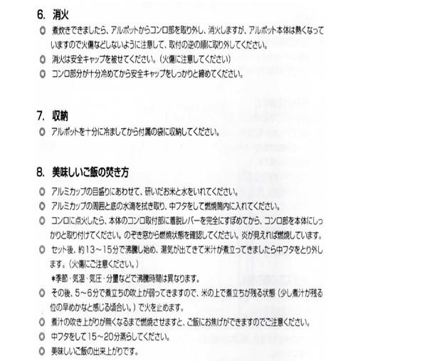 | 仕様 | 【燃料用アルコール】 火気厳禁 危険物品名:メチルアルコール 危険物品類名:危険物第四類アルコール類 【その他仕様】 容量:お湯の場合800cc、お米の場合2合まで 燃料タンク容量:約80cc 燃焼時間:約45分 |