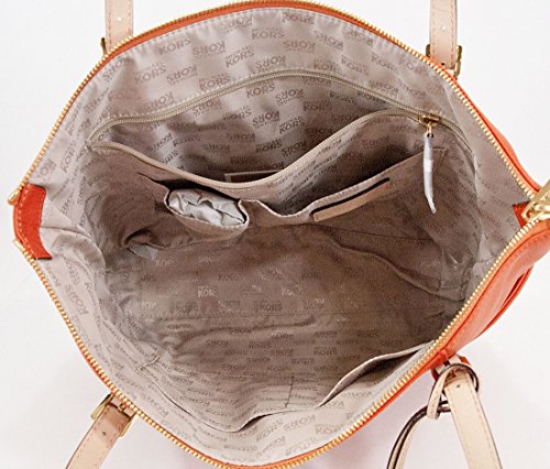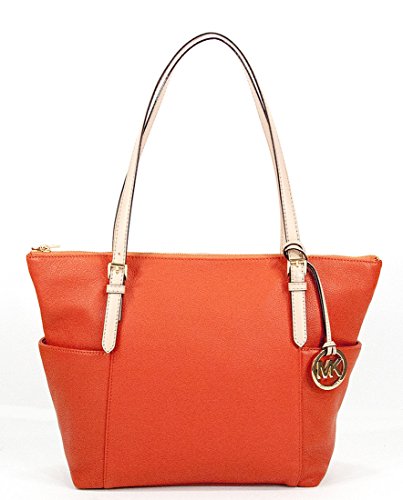 -. Binding : Apparel -. Brand : Michael Kors -. Color : Mandarin Orange -. Department : womens -. EAN : 0887042365140 -. Feature : Mandarin orange leather with tan leather trim and polished golden hardware / Lined interior with zippered pocket and 4 open slip pockets / Zippered top closure with side gusset pockets and a removable circular hang charm / Dual leather straps with a drop of about 8" / Measures approximately 11" (L) at the bottom tapering to 15" (L) at the top x 11.5" (H) x 4" (W) -. Model : 35T2GTTT8L -. MPN : KAL50386 -. PackageQuantity : 1 -. PartNumber : KAL50386 -. ProductGroup : Apparel -. ProductTypeName : ACCESSORY -. Size : Medium -. Title : Michael Kors Jet Set East West Top Zip Mandarin Orange Leather Tote -. UPC : 887042365140