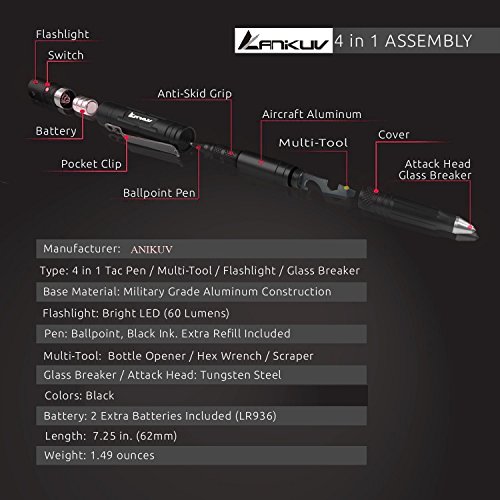 【ACCESSORIES】- It's a tactical pen with an LED flashlight, pen & Ultra durable carbide Tool, glass breaker,Ultra durable carbide Tool, Black ink refill and a custom gift box, Available Accessories: a extra refills and batteries.