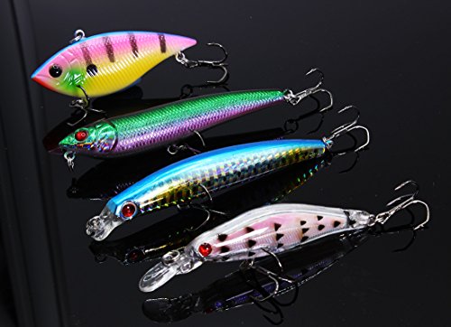 -. Feature : Bright colors to attract big fish / Each comes with 2 sharp treble hooks / Size: Each comes in a different size, from 3.35 to 5.5 inches in length / Material: PVC plastic, stainless steel / Storage box size 4 x 12 x 23 inches
