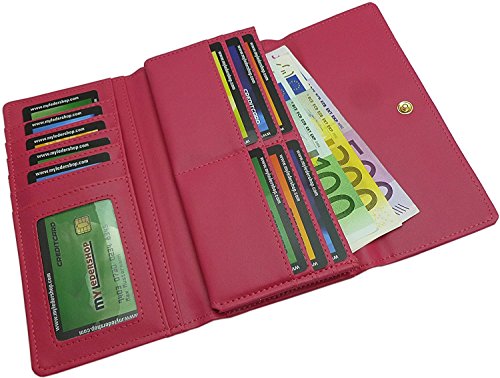 -. Brand : myledershop -. Color : Rosa -. Department : Damen -. EAN : 4054291011647 -. Feature : Große Damen Geldbörse / Zwei Geldscheinfächer und ein großes Hartgeldfach, welches mit einem Reißverschluss verschlossen wird / Zwei große Einsteckfächer / 12 Kreditkartenfächer, davon ist ein Fach hinter einer Folie / Länge/Breite/Höhe - 19cm/3cm/10cm -. ProductGroup : Koffer, Rucksäcke & Taschen -. ProductTypeName : LAGE -. Size : One Size -. Title : Große Damen Geldbörse mit vielen Fächern