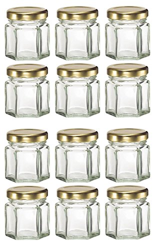 - Feature : Set of 12 - 1.5 Ounce Clear Hexagon Glass Jars with Gold Lids / Each Jar Measures Approx. 1.75" W x 2" H - Dishwasher Safe / Great for Wedding Favors, Shower Favors, Canning & More! / Fill Them with Honey, Jam, Candies, Beads, and Much More! / Great to Make Magnetic Spice Jars - Chemical Resistance