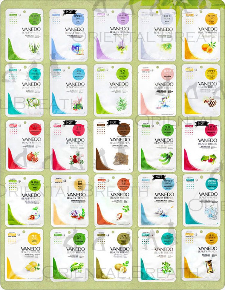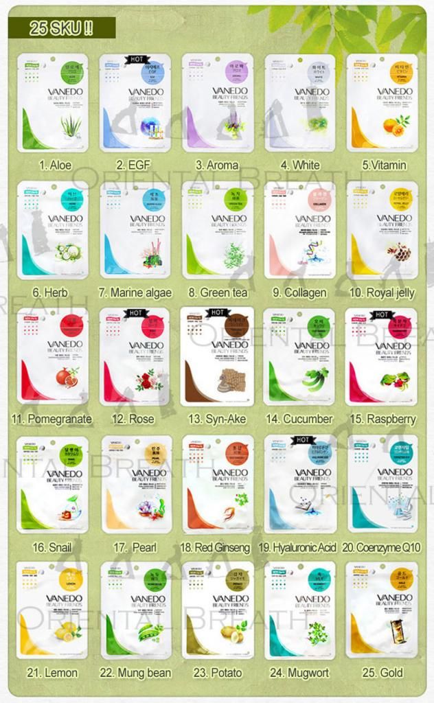 25 SKU (Use copy) : Aloe, E/G/F, Aroma, White, Vitamin, Herb, Marine Algae, Green Tea, Collagen, Royal Jelly, Pomegranate, Rose, Syn-Ake, Cucumber, Raspberry, Snail, Pearl, Red Ginseng, Hyaluronic Acid, Coenzyme Q10, Lemon, Mung bean, Potato, Mugwort, Gold