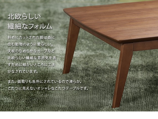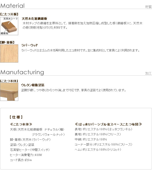 材質:こたつ天板-天然木化粧繊維板(ブラウン/ウォールナット・ナチュラル/楢)・ウレタン塗装、こたつ幕板・脚部-天然木(ラバーウッド)・ウレタン塗装、布団表地-ポリエステル100%(撥水フランネル)、布団コーナー・裏地-ポリエステル100%(フリース)、中綿-ポリエステル100%