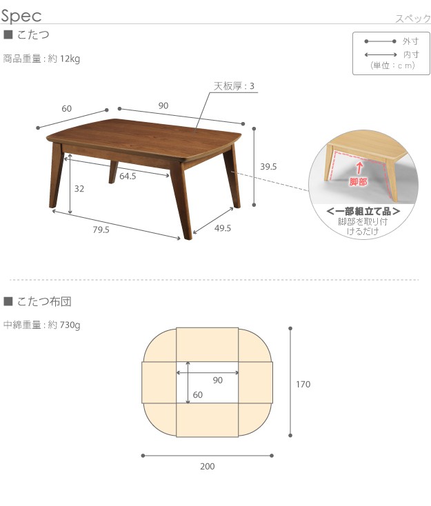 サイズ:こたつ-幅90x奥行60x高さ39.5cm・約12kg、布団-200x170cm・中綿量730g