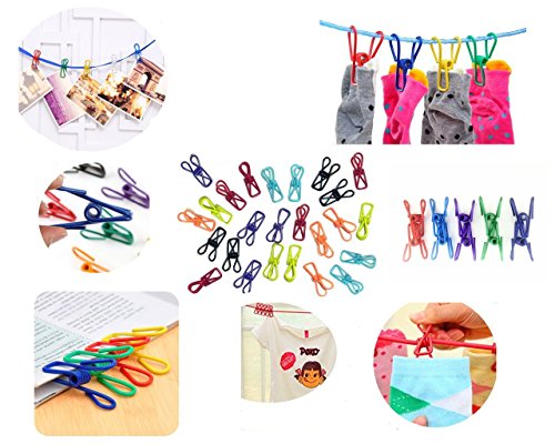 -. Feature : Metal clips with vinyl plastic coating ,Multi-purpose clips for clothes line, bag sealing, paper clips, etc / Assorted colors ,Pack of 30pcs, color will send randomly ; Clip size: 5.5*1.7*3cm ,2" clips with 3/4" jaw capacity, 1" throat-depth; / String clothesline through center of sP.R.Ing for clothespins, you can't lose! Great for securing paper, fabric and other material; loop handles allow easy hanging / Strong sP.R.Ing-steel coated with PVC for superior hold; non-scratch and corrosion resistant ,Super-handy & easy-to-use for clothesline & dozens of other uses; excellent quality / A good co-worker for housewives. Great for holding skirts, pants, shorts, socks, children's clothing, etc. A good co-worker for housewives.