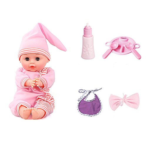 -. Title : Soft Body Open/Close Eyes Baby Doll Playset with Accessories Feeding Set-Bottle,Dish,Spoon,Fork,Bib,Bowknot(Pink)