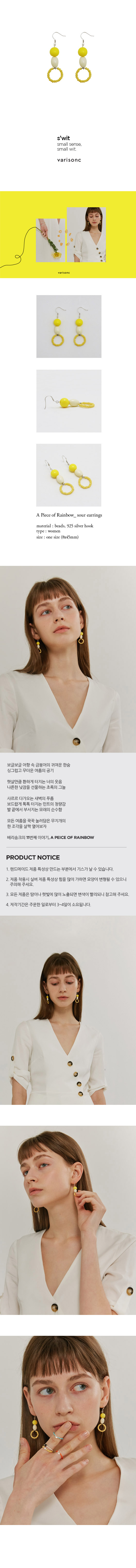 | sour earrings 상큼상큼 팡-터지는 새콤한 노랑이 드롭귀걸이 [제품 구매 안내] - 제작기간은 주문한 일로부터 7~14일이 소요됩니다. [A/S 안내] - 14일 이내의 끊어짐 등 제품 불량에 대해서는 varisonc가 왕복 택배비를 부담하여 교환해드립니다. - 14일 이후의 끊어짐에 대해서는 고객님께서 왕복 택배비(6천원)을 부담하시면 1:1로 무상 맞교환해드립니다. - 구매일 이후 3개월 동안 제품 하자의 경우 무상 A/S 해드리며 추가의 재료가 필요한 경우에는 수선비가 발생할 수 있습니다. - 단, 소재 특성 상 제품 하자가 아닌 고객 부주의로 인한 경우에는 A/S가 어려울 수 있으니 양해 부탁드립니다. - 수선 제품 왕복배송비는 고객 부담입니다. [교환 및 배송 안내] - 제작기간은 주문일로부터 3~4일이 소요됩니다. (영업일 기준) - 베리송크의 모든 제품은 주문제작상품으로 교환 및 환불이 어려우니 신중한 구매 부탁드립니다. - 제품 하자 시에는 동일한 제품으로 교환 가능하며, 받으신 포장상태 그대로 반송 부탁드립니다. |