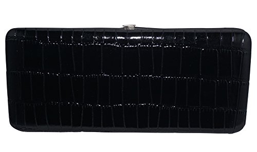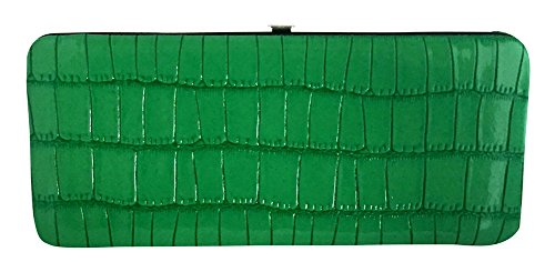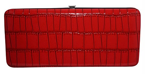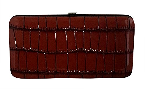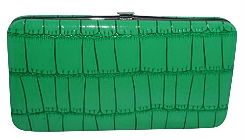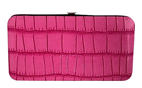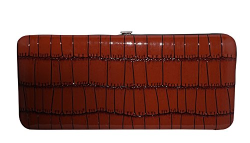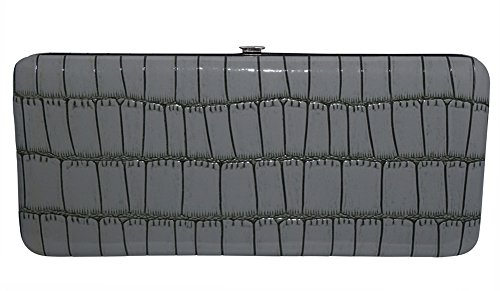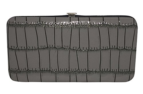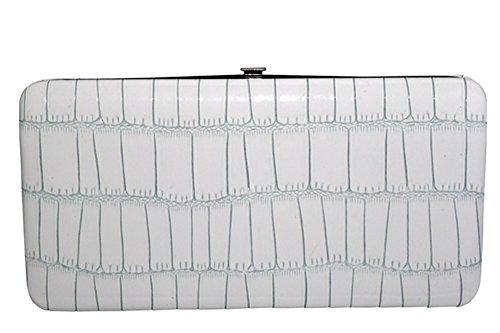 Trendy hard case clutch wallet with faux snakeskin leather print on front and back.