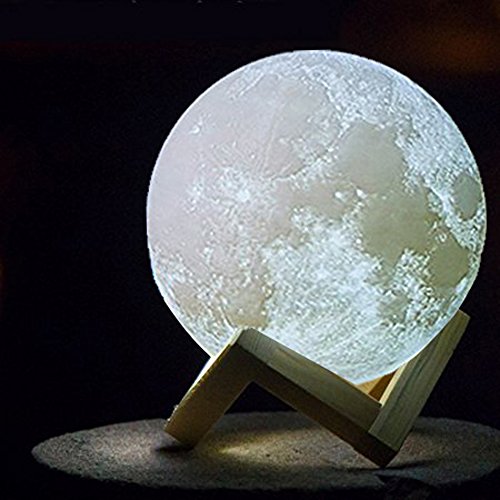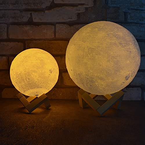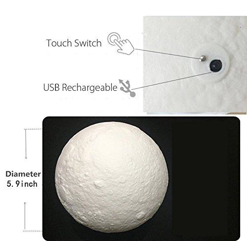 - ■3D TECHNOLOGY:Using the most advanced 3D printing manufacturing technology and price astronomical data, to creat a texture that is very similar to the real moon. Built in rechargeable lithium battery, with LED dual color light effect, give you surprise that you must be handing a real moon.