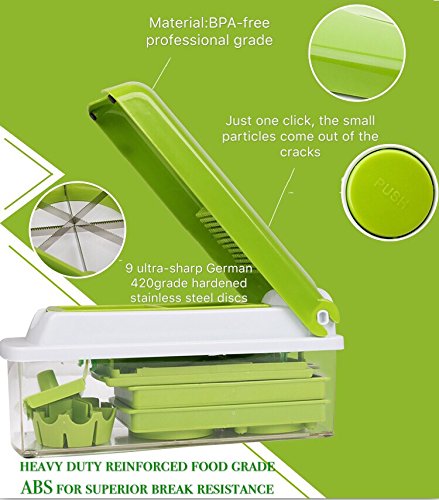 UNMATCHED QUALITY - Made from BPA-free professional grade, heavy duty reinforced food grade ABS for superior break resistance. 9 ultra-sharp German 420-grade hardened stainless steel discs for chopping/dicing the hardest vegetables/cheeses with 1 easy motion EVERY time