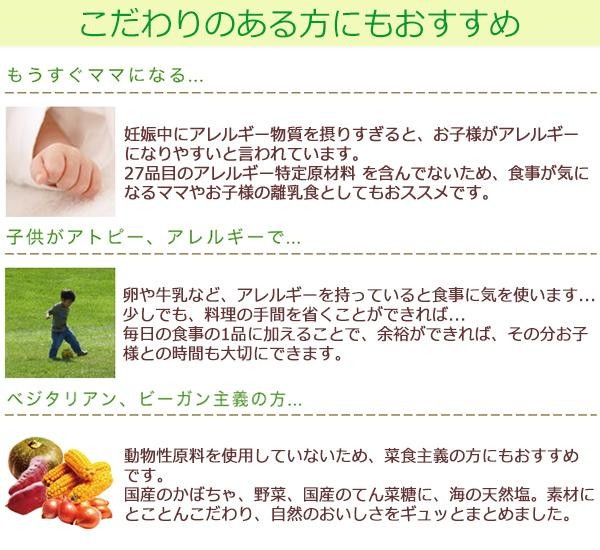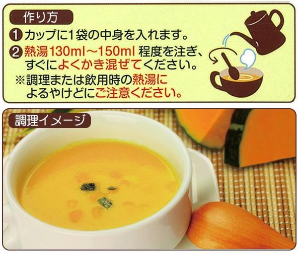 | 原材料 | 名称:乾燥スープ(ポタージュ) かぼちゃパウダー、てん菜糖、米粉、塩、たまねぎパウダー、酵母エキスパウダー、米でん粉、コーンパウダー(遺伝子組換えではない)、さつまいもパウダー |