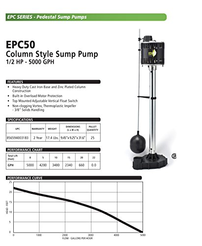 ECO-FLO Products EPC50 Pedestal Sump Pump with Vertical Float Switch, 1/2 HP, 5,000 GPH