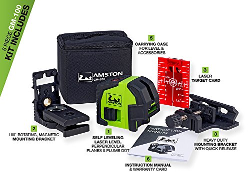 - KIT INCLUDES: AMSTON GM-100 Self-Leveling Laser, Easy-to-Adjust Magnetic Heavy-duty Clamp, Rotating Mounting Bracket with Magnetic Quick Release, Target, Carrying Pouch, easy-to-understand English Instruction Manual, Quick Start Guide & 1 Yr. Limited Warranty Card with upgrade to 2 years with product registration.
