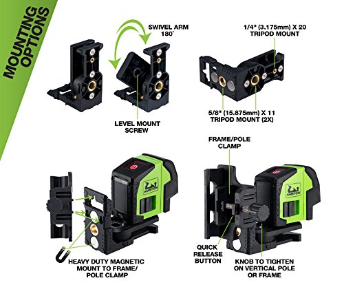 - MOUNTS EASILY to standard tripod with 1/4” screw or construction tripod with 5/8" screw. Super strong MAGNETIC HEAVY DUTY BRACKET ensures level stays firmly attached to vertical stud or pipe. QUICK RELEASE BUTTON option allows you to easily remove clamp to move position. 180˚ SWIVEL MOUNT makes it easy to check horizontal levels and ensure objects are perpendicular to each other across room span. Horizontal beam spread covers 320˚ +.
