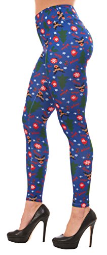 Just One Women's Winter Reindeer Christmas Leggings (Blue Reindeer Cheer, M)