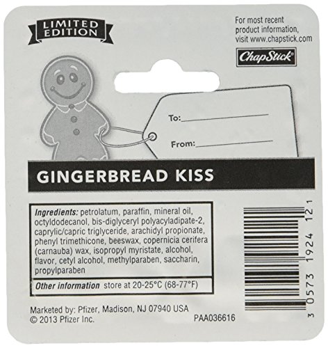 Get into the spirit of the season with this limited edition chapstick in Gingerbread Kiss flavor. Helps heal severely dry, chapped lips. Soothes and cools sores. Helps prevent and temporarily protects chafed, chapped, cracked, or windburned lips. Temporary relief of pain associated with fever blisters and cold sores. Three 0.15 ounce tubes on blister card.Feature