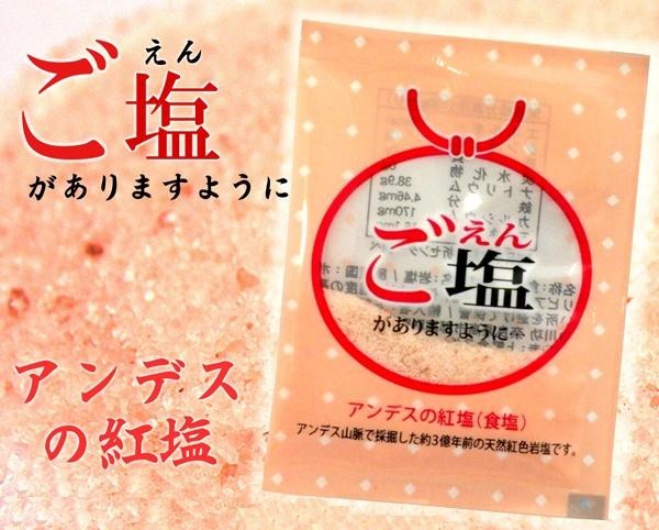 アンデス山脈で採掘した約3億年前の天然紅色岩塩です。出会った方への感謝の気持ちを伝える為にメッセージを込めたパッケージに仕上げました。御挨拶の品物・販促品としてお使い頂けます。お店の開店記念品や、景品、名刺につけてのご挨拶などに。 |