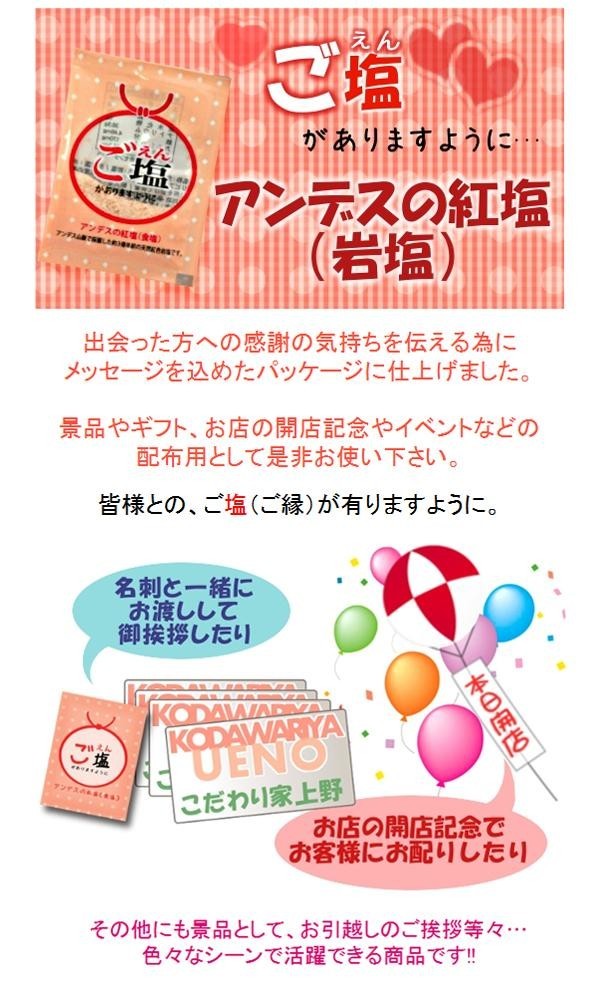 | アンデス山脈で採掘した約3億年前の天然紅色岩塩です。出会った方への感謝の気持ちを伝える為にメッセージを込めたパッケージに仕上げました。御挨拶の品物・販促品としてお使い頂けます。お店の開店記念品や、景品、名刺につけてのご挨拶などに。 |