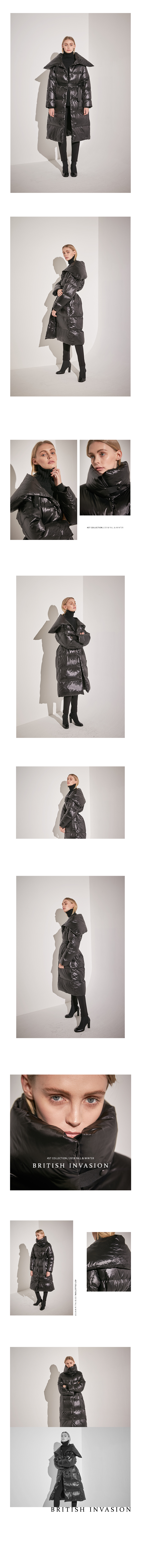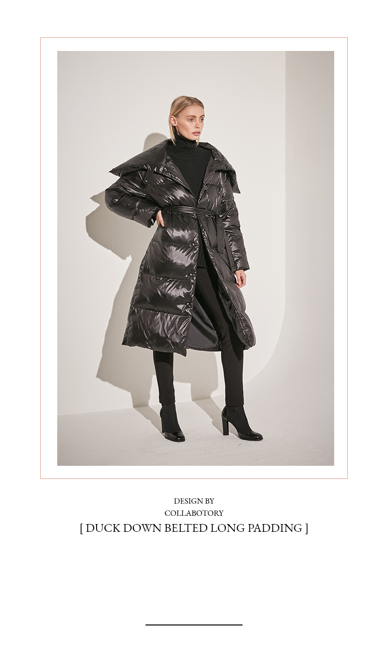 point : 포근하고 볼륨감있는 덕 다운 패딩, 볼륨감있는 하이넥 목 밴드 카라,가로결 스티치, 라인을 잡아주는 벨티드 스타일