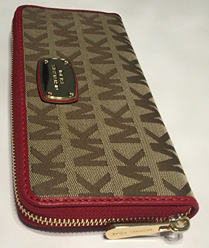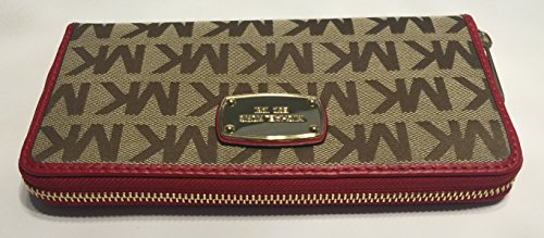 This new style rounded front plate wallet is wrapped in beautiful jacquard and soft leather with polished gold tone hardware. The front is accented with Michael Kors engraved name plate. This zip around style wallet features a leather and fabric interior with 8 credit card slots a zippered coin compartment and full length bill compartments. It measures approximately 8" (L) x 4" (H) x 1" (W) and comes in a beautiful gift box.Feature