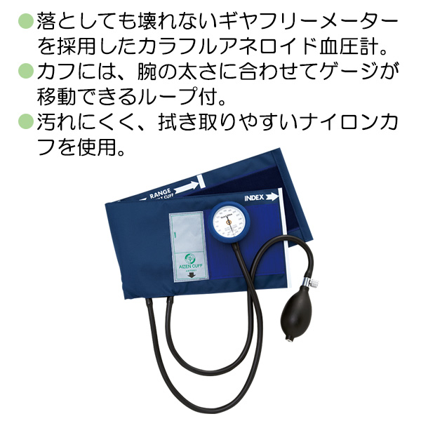 ●落としても壊れないギヤフリーメーターを採用したカラフルアネロイド血圧計。