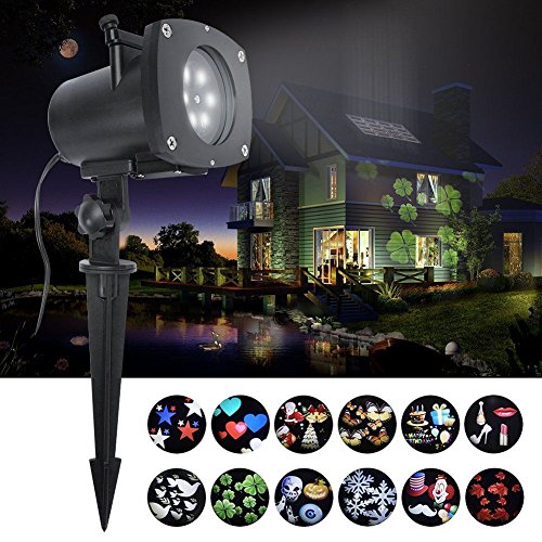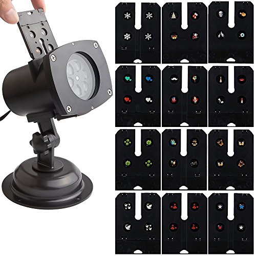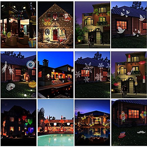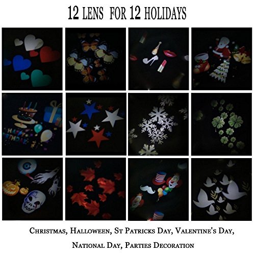 - # Christmas Landscape Projector Lights, 12pcs SWITCHABLE PATTERN LENS INCLUDED, such as heart shapes, snowflakes, clovers, high heels, pigeon, skeleton, maple leaf, birthday cake, Santa, christmas trees, butterflys, stars. This makes the light can be used year round and suits to more holidays and occasions!