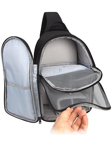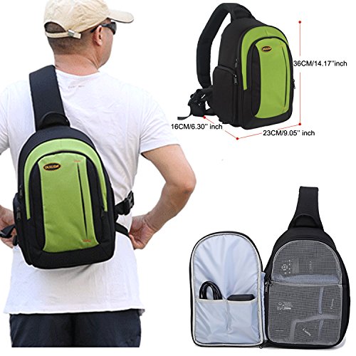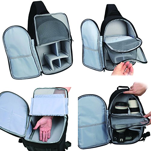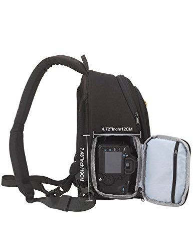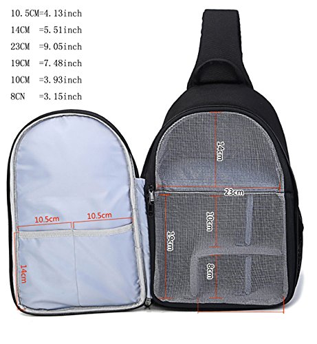 -. Feature : Padded customizable dividers, and mesh compartments fits all your photography gear and includes space for smaller accessories. / Carrying Capacity: 1 SLR DSLR cameras, 2-3 lenses, flash, and other photo essentials. Ample interior storage. / HIGH QUALITY INTERIOR: Padded adjustable dividers, mesh pockets for smaller accessories, tripod/monopod holder and quick access side doors. 9.05" X 6.30" X 14.17" inch (LxWxH). / COMFORTABLE DESIGN: The sling backpack design allows for quick rotation from the back to the front of your body, giving you easy and fast access to your gear. / SATISFACTION GUARANTEE: No Risk - 90 Day Full 100% Money-Back Satisfaction Guaranteed and any problems can feel free to contact with us.