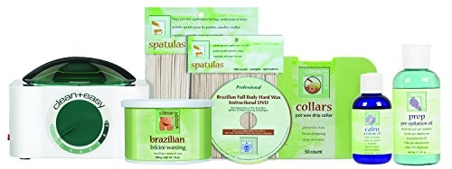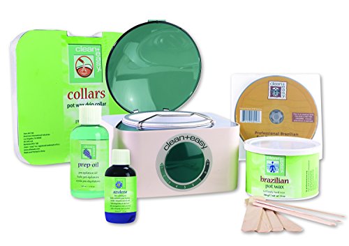 What is this product? Clean+ Easy Brazilian Waxing Kit is a perfect kit that contains everything need for a beginner. More info: 1 - Pot Wax Warmer 1 - Brazilian Pot Wax - 14 oz 3 - Prep oil pre epilation oil - 5 oz 1 - Azulene Skin Calming OIl - 2 oz 1 - Pack each Large, Small Calming OIl - 2 oz 1 - Pack Collars - 50ct.