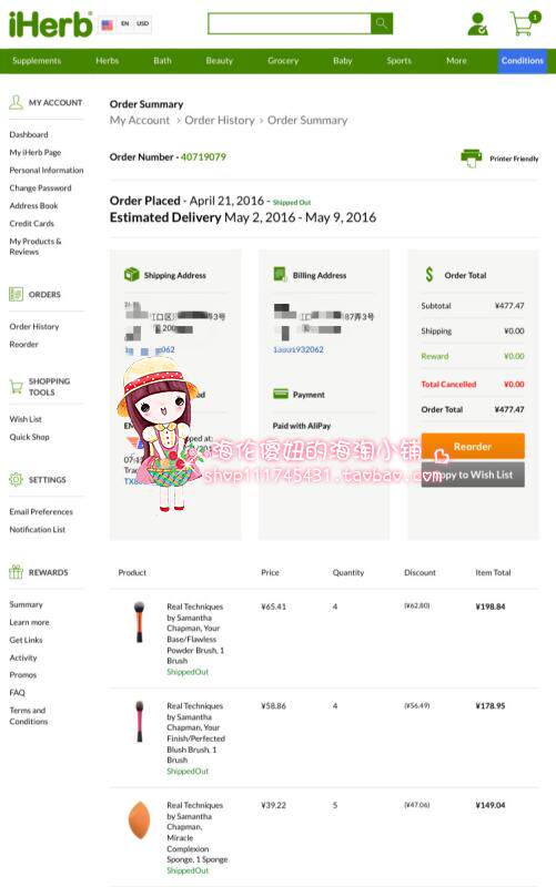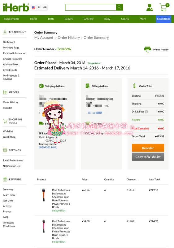 以下是店主在美国IHERB的近期订单和部分订单内容: