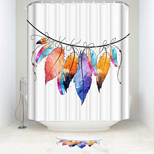 Indian Watercolor Feathers 14-piece Bathroom Set Bath Rugs with Fabric Shower Curtain and Decorative Matching Mat/Rings,72" x 72"