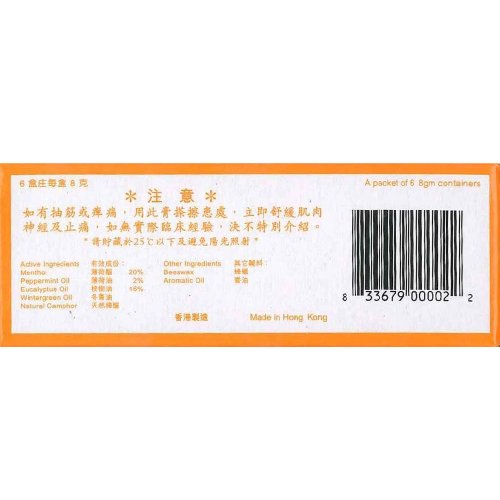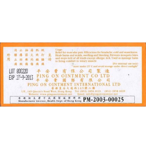 -. Binding : Health and Beauty -. Feature : Massage Ointment / Muscular Pain / Insect bites / Itchiness / Headache -. Label : Ping On Ointment Company Limited -. Manufacturer : Ping On Ointment Company Limited -. ProductGroup : Health and Beauty -. ProductTypeName : HEALTH_PERSONAL_CARE -. Publisher : Ping On Ointment Company Limited -. Studio : Ping On Ointment Company Limited -. Title : Ping On Ointment 8g vials Hong Kong
