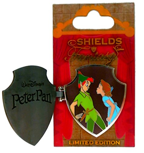 The hinged shield features the ship in clouds with Tink sprinkling fairy dust, the hook, and Peter's green hat with the red feather framed with silver on the outside